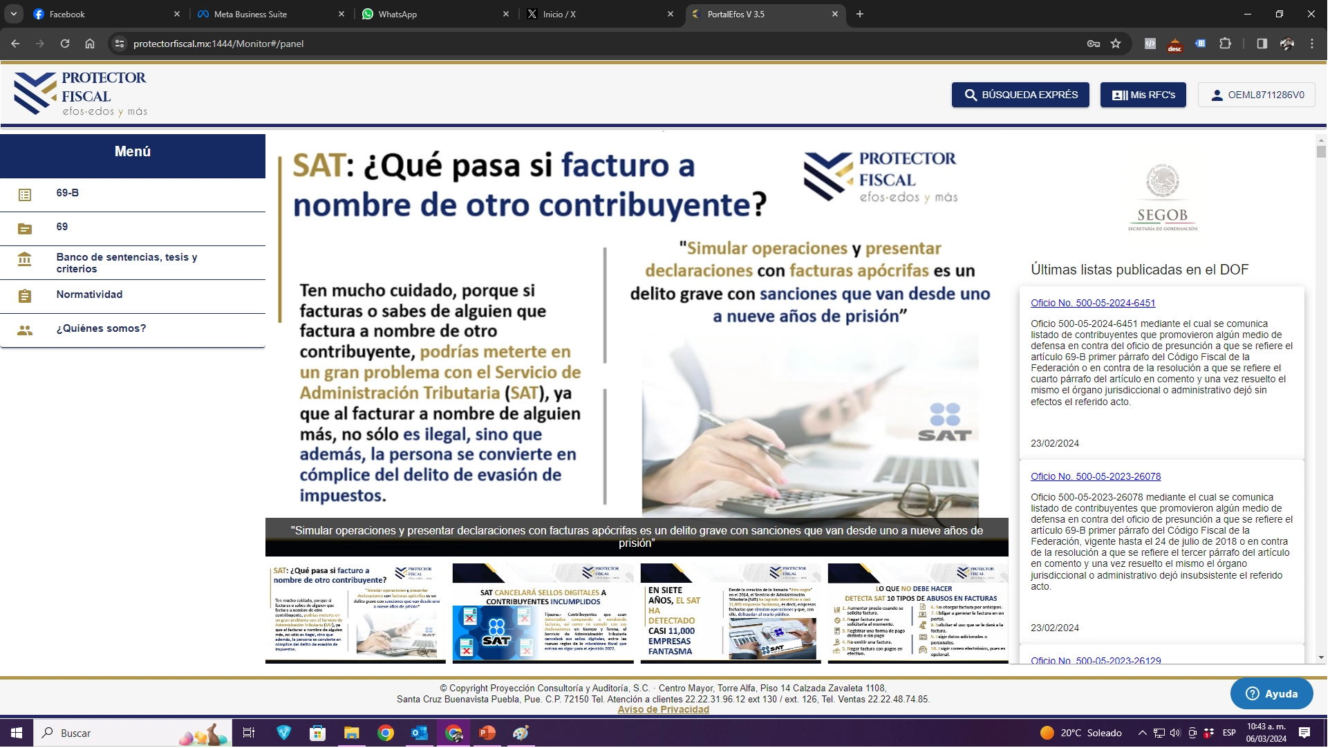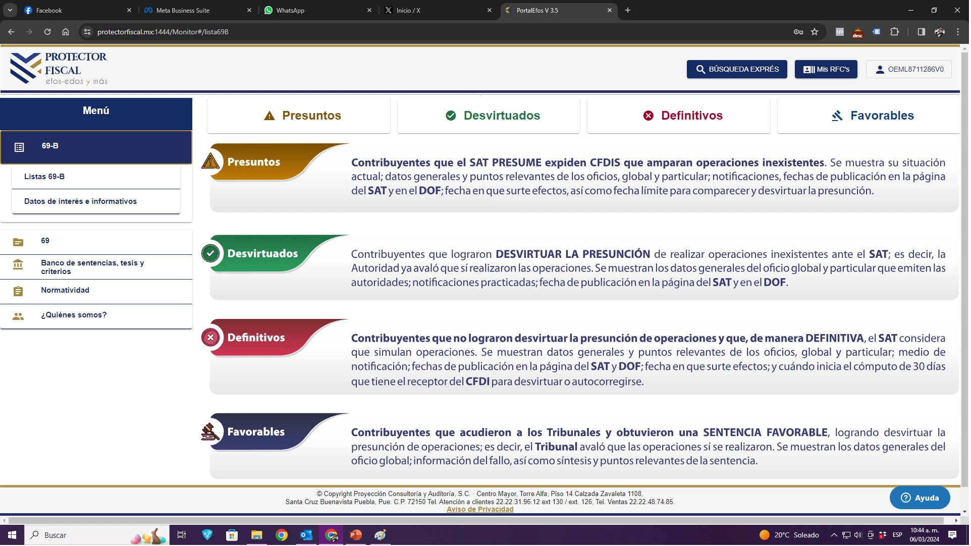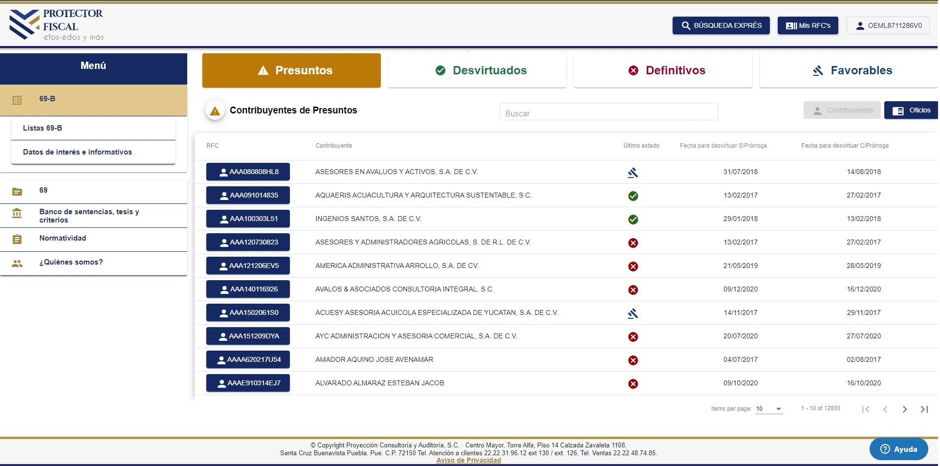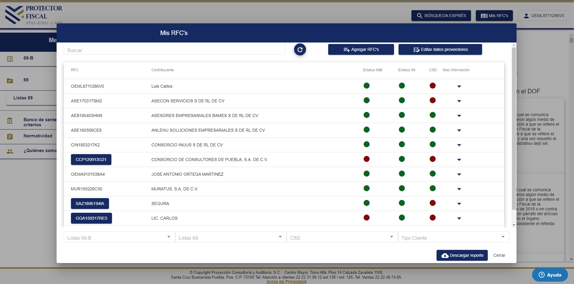 Registra los RFC’s de clientes o proveedores para vigilar en tiempo real si aparecen en las listas del 69, 69-B, y 69 B bis del CFF emitidas por el SAT, notificándole al usuario vía correo electrónico.
